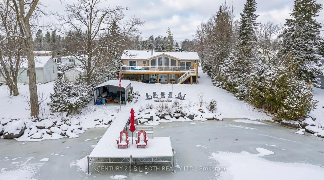 Don't be deceived by this home's modest roadside appearance-behind the front door awaits a private lakeside retreat offering over 2,700 sq. ft. of renovated living space. Ideal as a full-time residence or cottage getaway, this 2020 renovated waterfront property is just 20 minutes from Barrie and Orillia and minutes from Highway 11. Enjoy 81 feet of clean Lake Simcoe shoreline with a 72-foot dock and a shallow beach cove perfect for children and launching kayaks or paddle boards. Oversized glass doors on both levels frame stunning lake views as soon as you step inside. The upper level offers engineered hardwood floors, tongue and groove ceilings with pot lights, and an open living area centered around south-facing windows and a wood-burning fireplace. The kitchen features quartz countertops, a functional island, and upgraded LG appliances. Three bedrooms and two bathrooms include a primary suite with a custom closet, three piece ensuite, and private walkout. The lower level walkout includes a fourth bedroom, third bathroom, modern wet bar or pantry, and a laundry room. Vinyl flooring supports easy indoor-outdoor living, and a natural stone gas fireplace warms the spacious rec room. Step outside to a shaded patio leading to the 6-person Jacuzzi hot tub with lounger seating. Additional upgrades include full water treatment with UV and charcoal filtration, Rogers Ignite high-speed internet, smart-home features, new A/C (2022), new furnace with UV sterilizer (2021), new roof on house and garage (2020), 200-amp service, Generac generator, insulated triple garage with subpanel and heated workshop, invisible pet fencing, a 220V EV outlet, and two sheds, one with hydro. Move in and enjoy exceptional lakefront living.