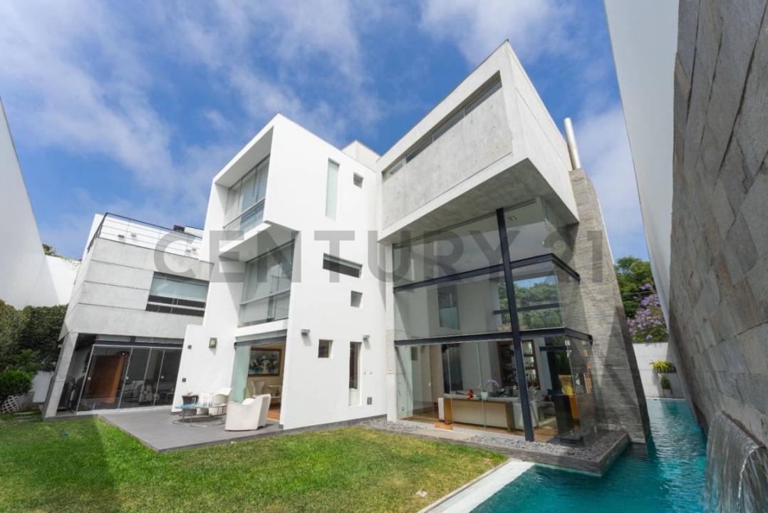 Ingreso con jardín frontal, áreas sociales de triple altura, chimenea escultórica y una conexión perfecta entre interior y exterior.