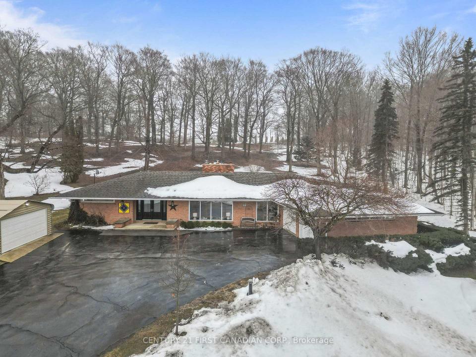 A rare opportunity to own a picturesque 5.7 acre country estate. This classic mid-century modern home offers exceptional privacy, natural beauty, and timeless architectural style. Large windows throughout the home invite abundant natural light while capturing peaceful views of the surrounding countryside. The main level showcases a traditional mid-century modern layout with distinct , well-designed living spaces. A spacious timeless kitchen provides ample room for cooking and gathering , while the large sunken living room with an attached dining area creates an inviting setting for both everyday living and entertaining. The home features 3 spacious main floor bedrooms, 2.5 bathrooms, and the convenience of main floor laundry. A bright 4-season sunroom offers the perfect place to relax and enjoy the changing seasons year round. The fully finished basement expands the living space, making this home an entertainer's dream with plenty of room for recreation, hosting guests, or additional living areas. The property also includes an attached double car garage and a large detached workshop, offering storage and functionality for tools, equipment or hobbies. Surrounded by 5.7 acres of scenic countryside, this exceptional property offers the perfect balance of privacy, outdoor enjoyment, and peaceful rural living, all while showcasing the enduring character of mid-century modern design.