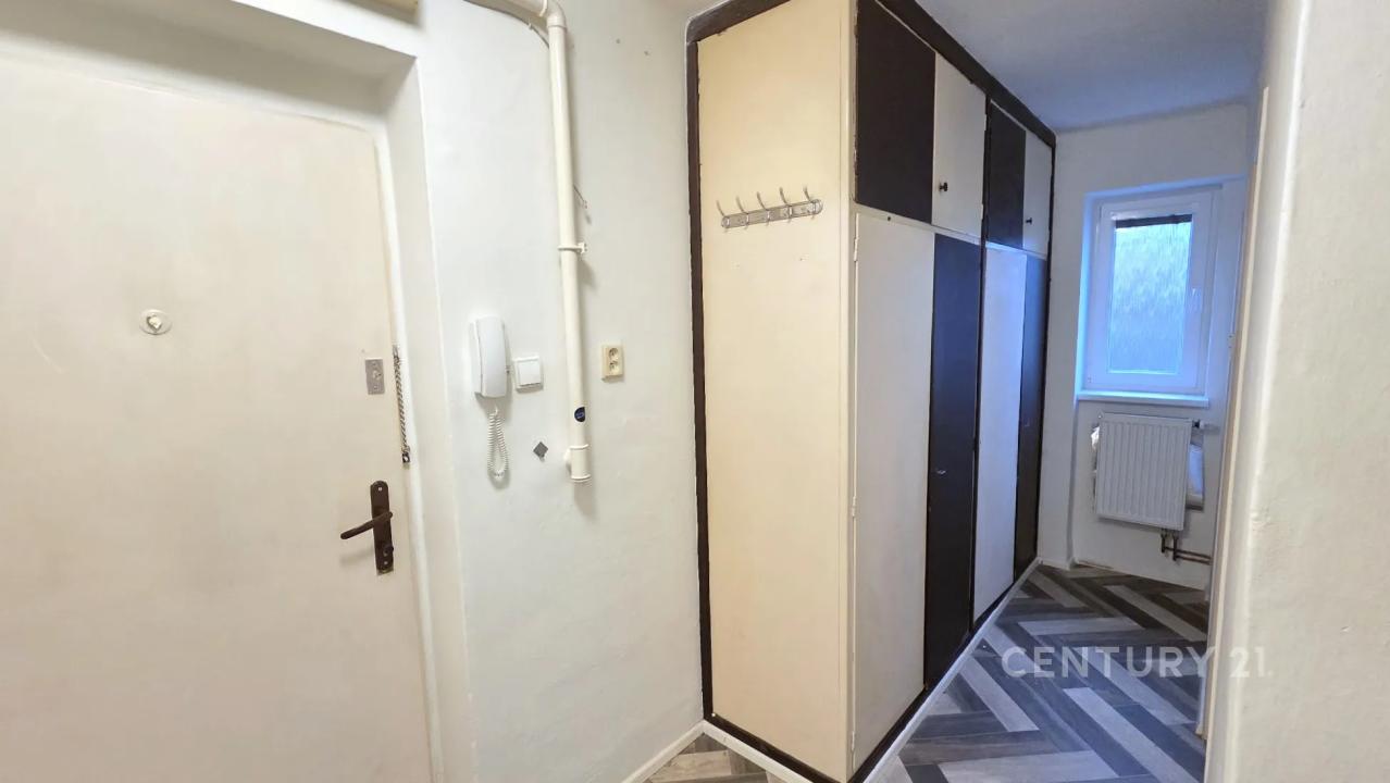 Vstupními dveřmi vejdeme do předsíně, ze které vcházíme do většiny obytných místností. V levé části předsíně se nachází vstup do koupelny a na samostatné WC, kde je umístěn plynový kotel. Z předsíně se dále dostaneme také do kuchyně s oknem do velkého vnitrobloku, v pravé části bytu se nachází pak obývací pokoj a ložnice, obě místnosti s okny směřujícími na jih. Byt je vytápěn plynovým kotlem, který zajišťuje i ohřev vody. Vaření též probíhá na plynu.