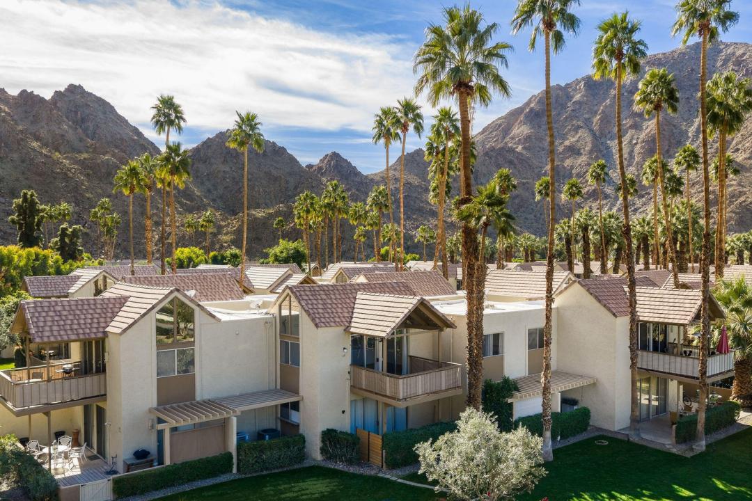 Have you ever dreamed of living in a treehouse? This is about as close as it gets in Southern California! This rare upper-level Mountain Cove residence is ideally situated against the mountains and has been fully remodeled—and even better, it is located on FEE LAND, meaning you own the land. Upper units in Mountain Cove are highly sought after for their vaulted, beamed ceilings, abundant windows and sliders, and, of course, the breathtaking views. Nestled in the heart of Indian Wells, Mountain Cove is surrounded by dramatic mountain scenery, lush palm trees, and sparkling community pools. Inside, this stylish remodel features a freshly painted interior, luxury vinyl plank flooring, quartz slab countertops with waterfall edge. The open-concept kitchen has been reimagined with slow-close white shaker cabinetry, modern hardware, trendy backsplash, all appliances, and a custom pantry closet. Both bathrooms have been updated with matching vanities for a cohesive design, and the guest bath includes a brand-new stackable washer and dryer. The spacious primary suite offers incredible views and a convenient mini office area. This is not a studio floor plan—enjoy a full living and dining area, a private primary suite, and two bathrooms. Craving privacy and a peaceful escape? Relax on your private deck while soaking in the stunning mountain views. Indian Wells residents enjoy IID electric for lower utility bills, plus exclusive city benefits, including discounts at participating restaurants, hotels, spas, and golf courses, along with complimentary use of the gym at the Hyatt Regency Indian Wells Resort. YES—this is a short-term rental friendly community with a 7-day minimum, making it an excellent full-time residence, second home, or investment opportunity.