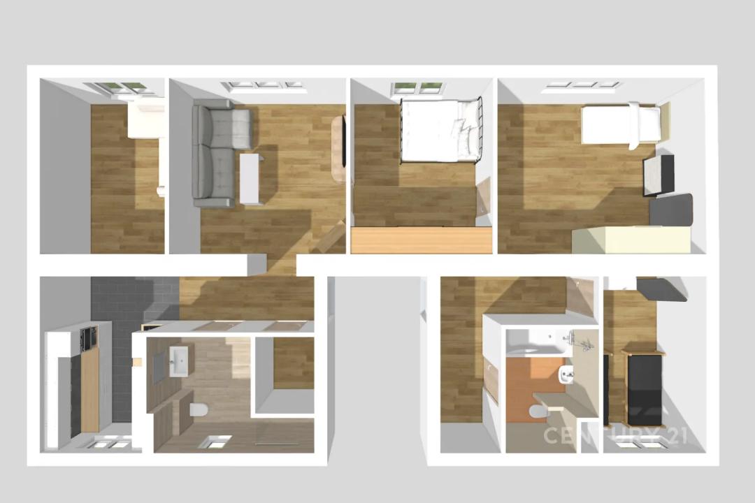 Celý prostor prošel kompletní rekonstrukcí a nabízí moderní standard bydlení. Dispozice zahrnuje pět samostatných pokojů a dvě koupelny, což je na trhu nájemního bydlení velmi žádaný a nedostatkový parametr.