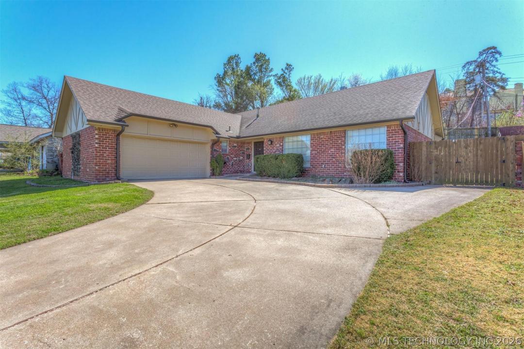 Full brick ranch in a prime central Tulsa location near LaFortune Park, Saint Francis Hospital, and convenient shopping and dining. This 3 bedroom, 2 bathroom home with a 2 car garage features an open concept floor plan filled with character and thoughtful details throughout. The living and dining areas showcase wood beam ceilings, built ins, a cozy fireplace with gas logs, and a wet bar with wine fridge and built in cabinetry that makes the space great for entertaining. The kitchen offers granite countertops, wood beam accents, a timeless brick inset that adds warmth and character, along with a newer cooktop (2023) and dishwasher (2025). All hard surface flooring throughout including updated plank flooring provides both style and durability. A dining nook with a built in bench seat offers comfortable everyday dining while still allowing room for a formal dining area if desired. The primary suite includes a private door leading directly to the backyard. Outside, the secluded backyard feels like a retreat with an incredible terraced yard featuring a striking natural stone retaining wall installed in 2024, along with a pergola with lighting and a dedicated putting green area. Additional features include gutters and a layout that blends comfort, character, and functionality in a highly convenient Tulsa location.