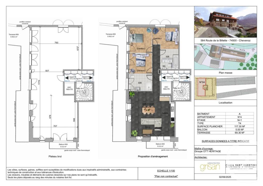 Nichée sur les hauteurs du village de Chevenoz, à l'écart de toute nuisance, cette résidence réinvente l'esprit des chalets de montagne. Avec son bardage en bois, ses larges balcons et ses toitures aux débords protecteurs, elle s'intègre harmonieusement dans son environnement naturel.