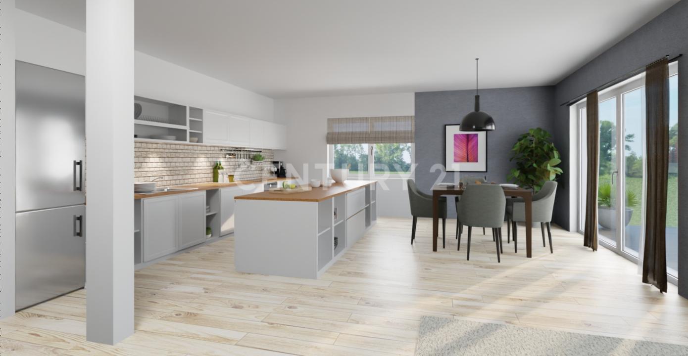 Das Herzstück bildet der großzügige Wohn-, Ess- und Kochbereich. Offen, hell und einladend, ist er der perfekte Treffpunkt für gemeinsame Mahlzeiten, Spieleabende oder gemütliche Stunden auf dem Sofa. Von hier aus gelangen Sie direkt auf die Terrasse – Ihr Rückzugsort im Freien, wo Sonnenstrahlen den Morgen verschönern und Sommerabende unvergesslich werden.