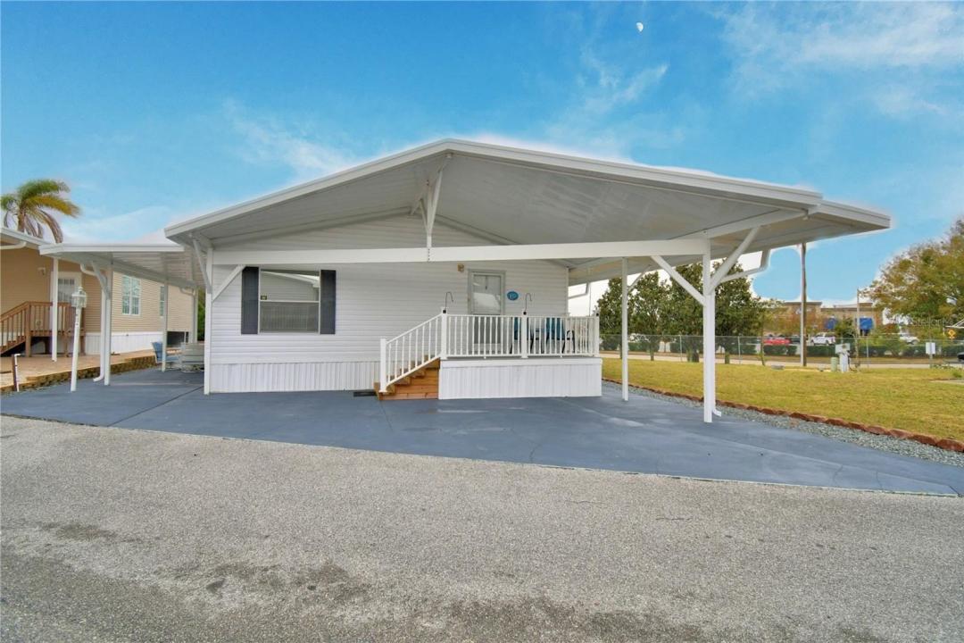 CENTRAL FLORIDA GATED 55+ COMMUNITY offering Doublewide 2 BEDS/2 BATHS with covered parking for vehicle and GOLF CART that conveys with purchase of home. FURNISHED HOME. Large Kitchen equipped with a dishwasher. Primary Bedroom has two closets and lots of room with bath (walk-in shower). Guest bath has shower/tub. Inside Laundry Closet with washer/dryer. Property is next to a vacant grass area to give it a feel of openness. Storage Shed with electricity. Rock yard for low maintenance. ROOF 4/2023 and HVAC 7/2024. Seller has done many upgrades. GOLF CART COMMUNITY with Recreational Building/Clubhouse, Solar Heated Pool, Mini Putt-Putt, Bocce Ball, Shuffleboard and PICKLE BALL COURT. Wonderful location near Shopping, Restaurants, Medical and major roadways to our EAST/WEST COAST BEACHES. Look forward to scheduling your private showing.