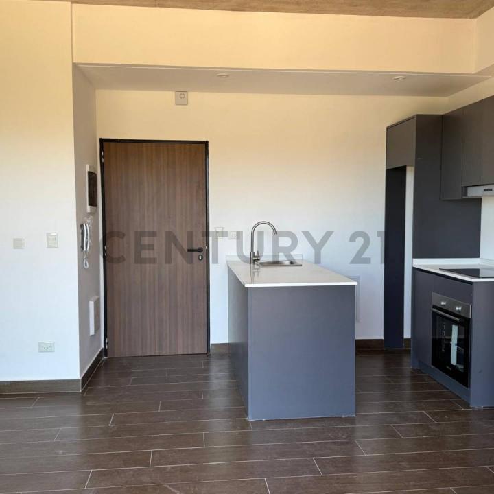 -Cocina con horno eléctrico y muebles de melamina.