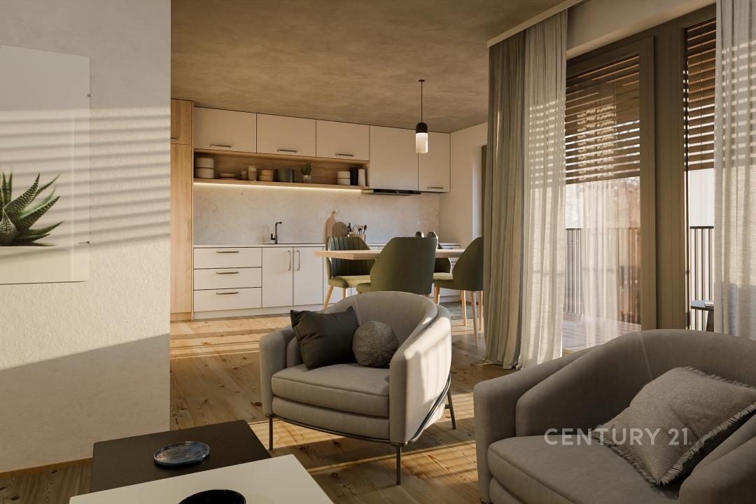 Byt je navržen s důrazem na funkční dispozici, dostatek přirozeného světla a efektivní využití prostoru. Díky terase se obytný prostor přirozeně rozšiřuje o venkovní část, která nabízí příjemné místo pro relaxaci či posezení.