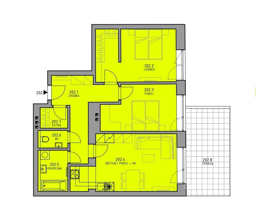 Je možné zakoupit byt 3kk aktuálně s terasou i bez. Kdy s terasou vychází cena o 400.000 Kč více.