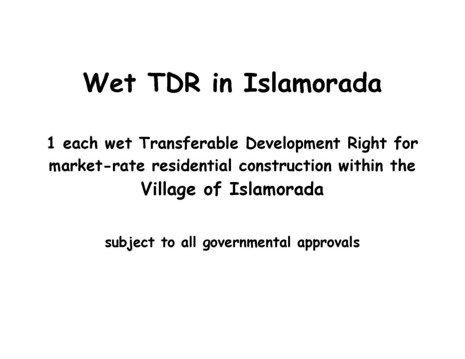 1 each wet TDR - one wet lot transferable building right to use for market-rate residential construction in Village of Islamorada, transferability to your lot is subject to approval by Village of Islamorada. Buyer to pay all costs associated with applying to Village of Islamorada for transfer to Buyer's lot and all costs associated with the closing of transaction. Offering is for a property right only, no real property is included.