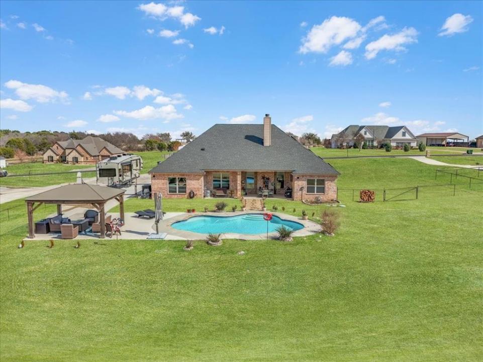 Set on a full acre in Stanford Estates with no HOA, this property offers a heated saltwater pool and a well-designed, open-concept layout built for comfortable living. Inside are 4 bedrooms, 3 full bathrooms, and a dedicated office with a closet that can serve as a 5th bedroom. The spacious living area features wood-look tile flooring and a stone fireplace, flowing into a kitchen with granite countertops, stainless steel appliances, a large island, breakfast bar seating, and a walk-in pantry. A functional mudroom with built-ins and bench seating adds everyday organization, while the oversized utility room offers additional cabinetry and direct access to the primary closet. The private primary suite includes a vaulted ceiling, sliding bar door, dual vanities with granite, a soaking tub, separate tiled shower, and a generous walk-in closet. Outside, enjoy pipe fencing, a gazebo, and a sprinkler system. Recent updates include new carpet and a new roof, plus a Pelican whole-home water filter-softener system. A three-car garage and extra concrete provide room for storage and RV parking. This energy-efficient home features solar panels with a backup battery system that help maintain average electric costs around $50 per month, along with full spray foam encapsulation that enhances overall efficiency and comfort. Located in Springtown ISD with easy access to Highway 199, the home offers a quiet setting just 30 miles northwest of Fort Worth.