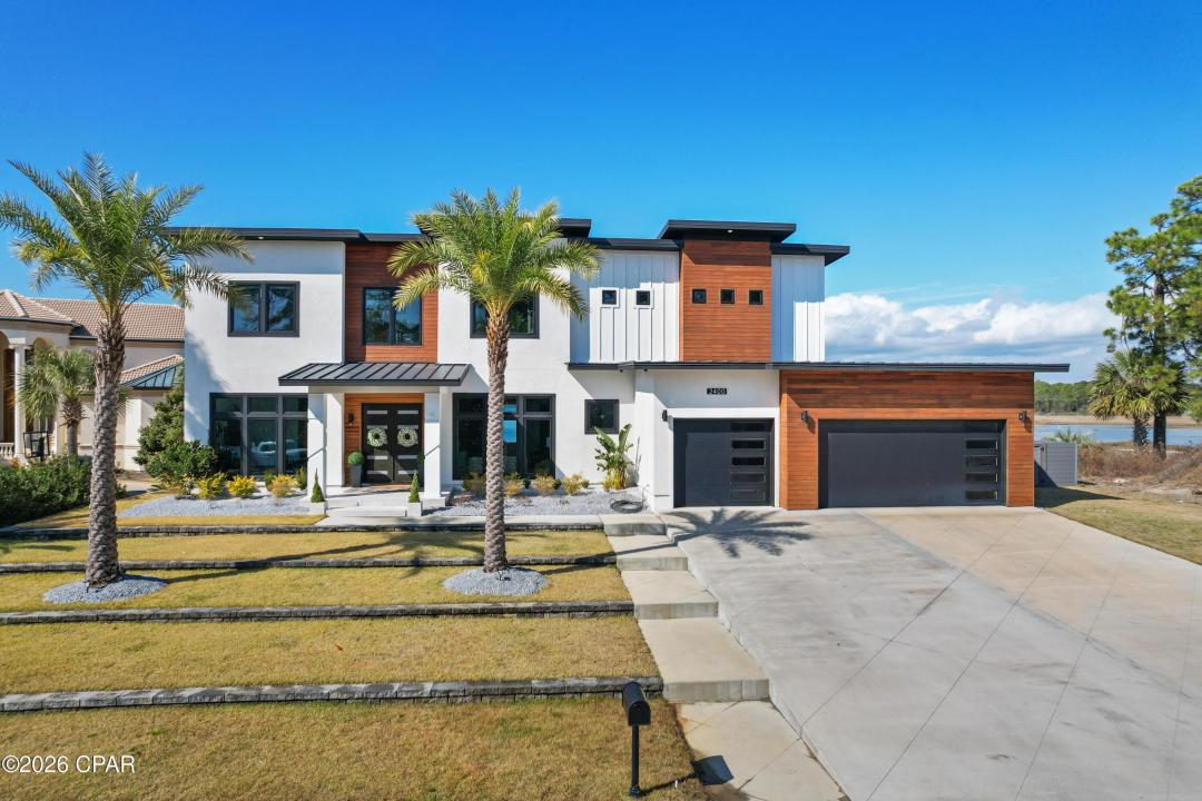 Experience refined waterfront living in this stunning, modern, two-story home perfectly positioned on the bay in Lynn Haven. Designed to maximize comfort and views, this expansive residence offers deep water access and unobstructed sunset views. Upon stepping outside you're greeted with a spectacular bay front pool overlooking the water that creates a truly unforgettable backdrop for everyday living. The interior of this home features upscale appliances, designer fixtures, and clean modern finishes throughout. A perfect blend of luxury with family functionality. The first level features an office, downstairs bedroom and bathroom, and a den that could transform to a formal dining room for buyers. The master bedroom with balcony will transport you to a vacation style oasis with a large bathroom, his and her closets, soaking tub and a glamourous shower. Two more bedrooms accompany the primary upstairs and feature custom woodwork and would rival the primary with ample space, separate shower, soaking tub and views. Generous living spaces and a seamless indoor, outdoor flow make this home perfect for entertaining. This prime waterfront property delivers the best of coastal living while being in the desirable Lynn Haven community.