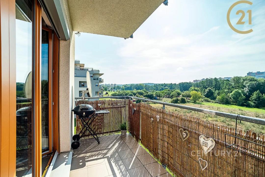 Jižní orientaci má obývací pokoj s kuchyňským koutem (34,4 m²) se vstupem na hlavní balkon (5,8 m²) s otevřeným výhledem do zeleně tichých meandrů Botiče a též nejmenší ložnice pracovna (10,1 m²).