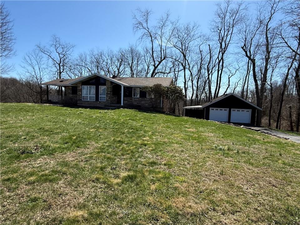 If privacy and tranquility are part of your dream home, welcome to 112 Matthew Lane. This contemporary stone-and-wood ranch offers easy one-level living on 1.24 acres, backing to a large wooded area. Inside, an updated kitchen features white cabinetry, stainless-steel appliances, and granite countertops, flowing openly to the dining and living areas. A side door off the kitchen leads to a covered porch with views of the expansive back and side yards. The living room is a focal point with cathedral ceilings, exposed wood beams, and a gas stone fireplace. Numerous windows fill the home with natural light—perfect for entertaining. The spacious main bathroom has been updated with dual sinks, abundant storage, tiled floors, and a tub/shower. Each bedroom includes a ceiling fan and plenty of light. Downstairs offers a large finished living area plus an updated full bathroom. Outside you'll find a generous level yard and a two-car detached garage.
