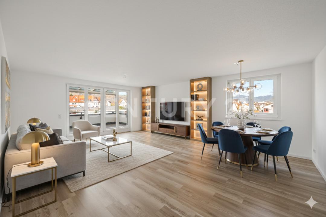 Der großzügige Wohn- und Essbereich bildet das Herzstück der Wohnung und ist offen mit der Küche verbunden. Die hochwertige Einbauküche in moderner Betonoptik ist mit Markengeräten von Siemens ausgestattet und lässt sich bei Bedarf durch eine Schiebetür vom Wohnbereich abtrennen. Bodentiefe Fenster im Wohnzimmer sorgen für eine helle, freundliche Wohnatmosphäre, sind mit elektrischen Rollläden ausgestattet und verfügen – wie alle Fenster der Wohnung – über hochwertige Plissees der Marke MHZ.