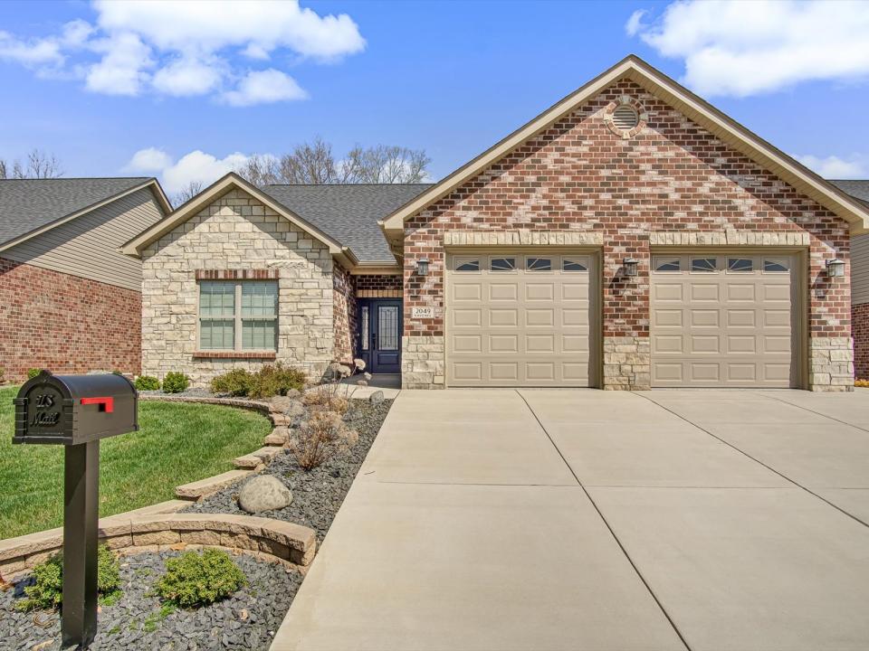 Elegant Zero-Entry Villa with High-End Custom Finishes Experience effortless living in this stunning, detached standalone villa. This zero-entry home combines architectural beauty with practical accessibility, featuring a striking brick and stone exterior and professional landscaping with custom retaining walls. Inside, the main level impresses with 9-foot ceilings, durable LVP/LVT flooring, and cased windows outfitted with custom blinds. The heart of the home is a vaulted living room anchored by a gas fireplace and an elegant iron-spindled staircase. Culinary enthusiasts will love the custom kitchen, featuring quartz countertops, subway tile, and high-end built-in appliances. Relax in the light-filled sunroom or step through the four-panel sliding doors to a truly unique EZ Breeze Lanai. This versatile space features a puncture-resistant vinyl panel system and a power privacy screen, leading out to a 10x16 Trex deck with a SunSetter retractable awning. The primary suite is a private retreat with 36-inch doors, a tray ceiling, a bay window and a spa-like ensuite designed for longevity with a walk-in shower, reinforced walls for grab bars. Mechanicals & Tech: CAT 5 wiring with battery backup, Kinetico water softening/Reverse Osmosis system, radon mitigation, and a generator with a 10-year transferable warranty. Expanded Garage: Oversized 24x25 space with 8’ doors, service door, epoxy flooring, and an integrated storage system. Listing broker has attempted to offer accurate data & info is deemed reliable but not guaranteed. Square footage may not be accurate. Buyers & agents are responsible for verifying accuracy. Camera/Video on premises.
