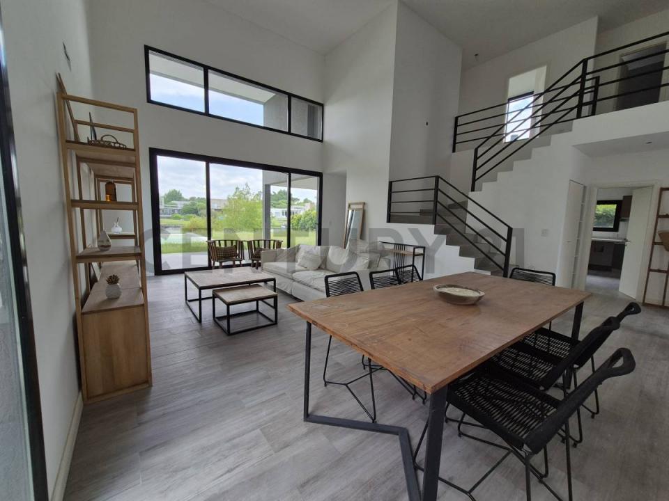 Área 5- Tu nuevo hogar, Hall de ingreso con placard y toilette de recepción, habitación o escritorio con bano completo, Living comedor con techos en doble altura, cocina completamente equipada con muebles de bajo mesada, alacena, Isla central / comedor diario, lavadero con acceso independiente, Planta Alta: hall de descanso, cuatro habitaciones, Suite principal con bano doble bacha, vestidor y vista directa al agua, Tres dormitorios con placard completo y un bano completo que comparten