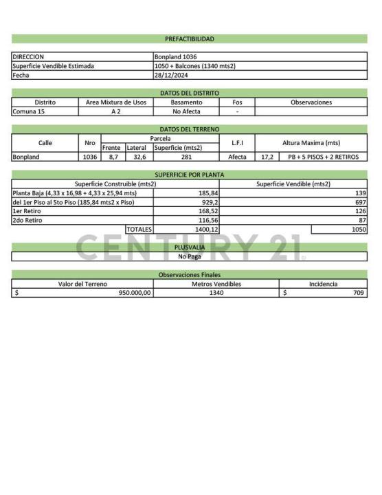 Potencial constructivo: Hasta 1,340 m² totales , con aproximadamente 1,050 m² vendibles más balcones.