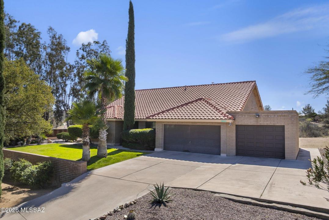 Welcome to this beautifully maintained home located in a quiet neighborhood in the heart of Nogales. Situated on an expansive 0.55 acre lot, this 1,843 sq ft residence offers space, comfort, and pride of ownership throughout. The exterior welcomes you with mature landscaping, large shade trees, decorative rock, lush green grass, and palm trees, creating a serene and inviting setting. Built with durable slump block construction, the home also features a tile roof, chimney, custom wrought iron doors, and a spacious 3-car garage with additional storage. The generous lot provides ample parking and room for multiple vehicles or recreational equipment. Inside, the home is exceptionally well kept and thoughtfully designed. Enjoy a bright living room, formal dining room, and a comfortable family room, perfect for everyday use or entertaining. The spacious kitchen features granite countertops, a center island, and stainless steel appliances, making it both functional and stylish. All bedrooms are generously sized, including a primary suite that offers space for a cozy sitting area. The primary bathroom features double vanities, a large walk-in shower, a relaxing soaking tub, and a walk-in closet. Step outside to a covered back patio where you'll find a private, peaceful backyard with low maintenance landscaping and a large concrete pad ideal for gatherings. The yard is fully gated for added privacy and peace of mind. An additional highlight is the approximately 450 sq ft fully equipped sunroom, offering endless possibilities. This versatile space can be used as a home gym, outdoor kitchen, entertainment area, or greenhouse. With beautiful front views, a spacious lot, and a central location in town, this home offers the perfect blend of comfort, privacy, and convenience.