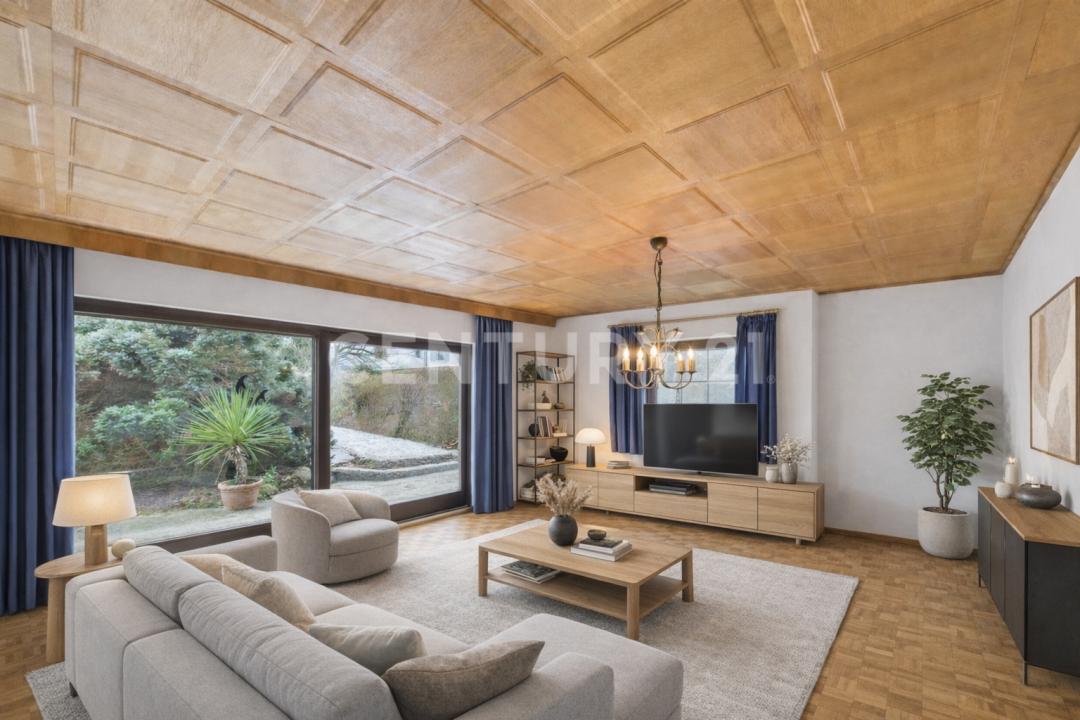 Im Erdgeschoss befindet sich eine 2,5-Zimmer-Wohnung mit ca. 88 m² Wohnfläche, die mit einer sonnigen Südterrasse und schönem Blick in den Garten überzeugt. Die zweite Einheit erstreckt sich über Ober- und Dachgeschoss und bietet als großzügige 5-Zimmer-Wohnung ca. 152 m² Wohnfläche. Hier erwarten Sie drei Schlafzimmer, eine geräumige Küche mit Essbereich, drei Balkone, ein modernes Tageslichtbad sowie ein Gäste-WC. Ein besonderes Wohnhighlight ist das nachträglich in Ständerbauweise errichtete Wohnzimmer mit Kachelofen und Fußbodenheizung.