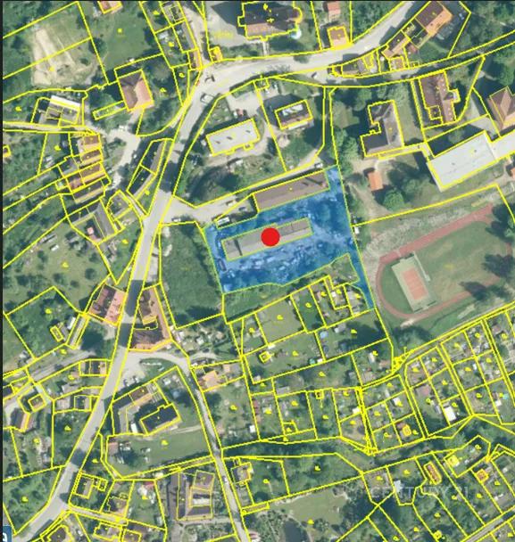 Hlavní stavební parcela o zastavěné ploše 597 m² a přiléhající pozemek o výměře 3 093 m².