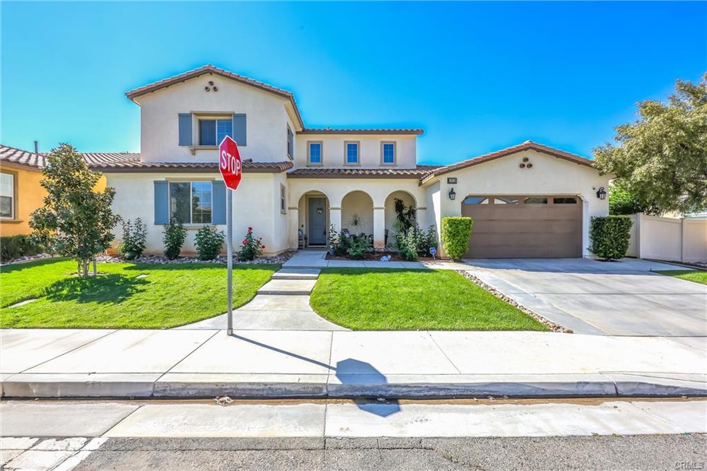 Welcome to 1619 Croton Street, a stunning Spanish Mediterranean two-story nestled in one of Beaumont's most desirable neighborhoods. The warm stucco facade, clay tile roof, and charming covered front porch create a welcoming first impression that carries all the way through the front door. Step inside to a soaring two-story entry foyer bathed in natural light from transom windows above the elegant staircase. The main level is designed for the way families actually live, flowing seamlessly between a formal living room and a generous open-concept family room, giving everyone room to gather or find a quiet corner. Crown molding and recessed lighting add polished finishing touches throughout. The chef-worthy kitchen is the true heart of the home. A large granite island with seating for four anchors the space, surrounded by gleaming white cabinetry, subway tile backsplash, stainless steel appliances, including a built-in double oven and refrigerator, and pendant lighting that sets the perfect mood. The dining area sits just beyond, with sliding glass doors opening directly to the covered back patio for effortless indoor-outdoor entertaining. A dedicated home office, a full bathroom, and a comfortable bedroom on the main floor make this layout exceptionally versatile, perfect for guests, in-laws, or a quiet work-from-home setup. Upstairs, a spacious loft offers endless possibilities as a media room, playroom, study space, or second family room. The primary suite is a true retreat. A private balcony frames breathtaking mountain and valley views, while the spa-inspired en-suite features dual vanities with a dedicated makeup station, a deep-soaking tub, a glass-enclosed shower, and generous storage. Three additional well-sized bedrooms with scenic views and plush carpet share two full bathrooms, each with dual sinks and clean white finishes. Thoughtful upgrades include a whole-home water softener, leased solar panels to reduce utility costs, and an epoxy-finished garage floor. The covered front porch and back patio make outdoor living a year-round pleasure under the beautiful skies of the Inland Empire. The HOA offers an impressive lineup of resort-style amenities, including three pools, three spas, two BBQ areas, a playground, a basketball court, and a bocce court. With this much to enjoy just steps from home, every day feels like a getaway. Conveniently located minutes from top-rated schools, shopping, dining, and the I-10 freeway.