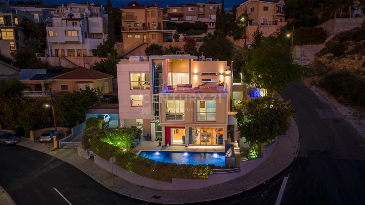 Situated in the prestigious area of Ayia Fyla, and standing on a generous 646m2 elevated Corner Plot, this modern villa offers breathtaking City & Sea views and a comfortable living experience. The property spans 483m² of unique internal areas, 76m2 of covered verandas, 263m2 of uncovered verandas, surrounded by 136m2 of beautifully landscaped green areas. The property spans on 3 levels including 6 bedrooms, 4 bathrooms, an aquarium, a glass tunnel elevator and a large swimming pool.