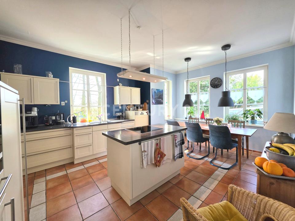 Ein besonderes Highlight ist die großzügige Wohnküche: Ausgestattet mit einem einladenden Tresen und viel Platz für gemeinsames Kochen, wird sie zum zentralen Treffpunkt des Hauses. Der charmante Erker bietet zudem den idealen Platz für einen großen Esstisch und schafft eine stimmungsvolle Atmosphäre für gesellige Stunden.