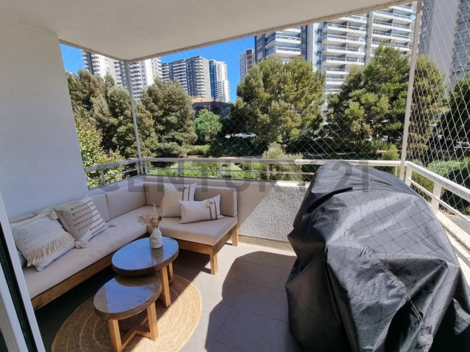 Departamento de 3 dormitorios y 2 banos, principal en suite. Con excelente estado de conservación. Cuenta walking closet en dormitorio principal, segundo dormitorio amplio con closet y tercer dormitorio ideal para home office. Ventanas termopanel y piso flotante en zonas de estar y porcelanato en zonas de cocina y bano. Terraza de excelente tamano con vista al Parque de Costa de Montemar con un agradable sol de medio día. Cocina independiente con amplia loggia. Encimera a gas, horno eléctrico, campana, cubierta de granito y variados muebles. Agua sanitaria por calefont en la loggia del departamento recien instalado. Cuenta además con 1 estacionamiento subterráneo y 1 bodega.