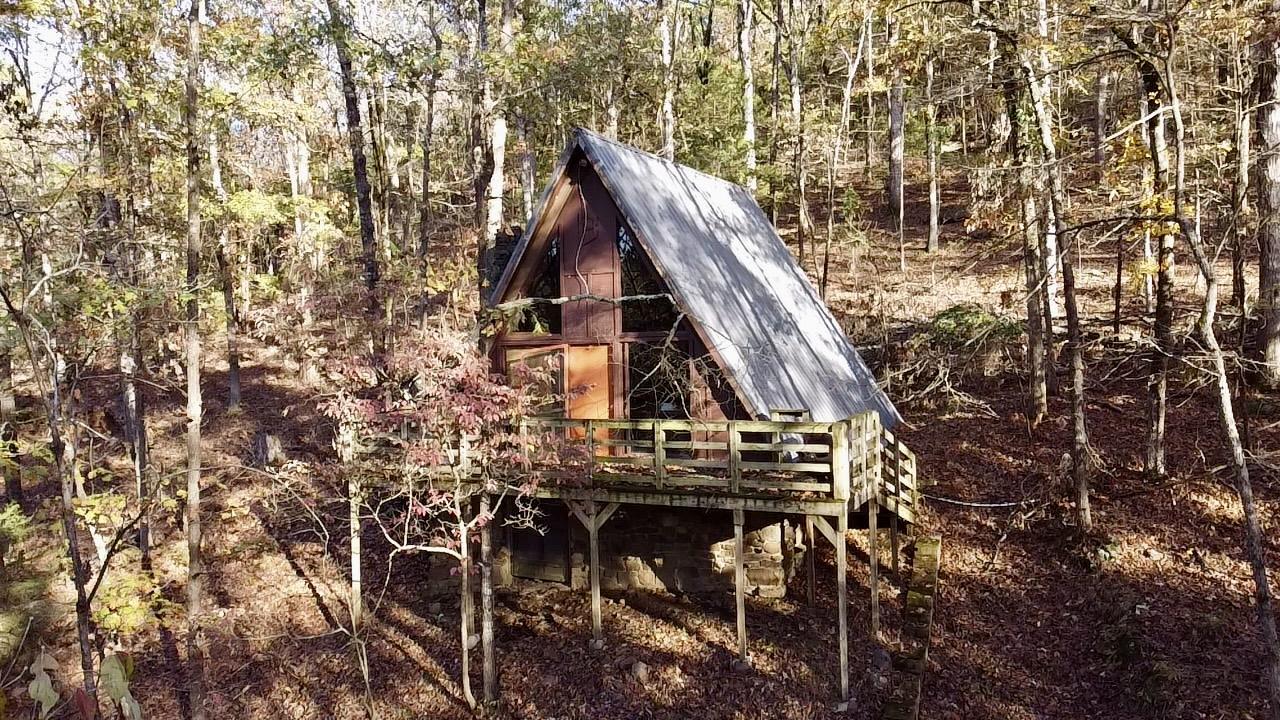 Unique 2BR A-Frame cabin adjoining Corps of Engineers property on Big Piney Creek, located between Piney Bay and the Arkansas River. The wooded lot features a large deck overlooking the creek with easy, level access to the water for fishing and views. Inside offers vaulted ceilings with exposed wood beams, a wall of windows framing nature, and a native rock wood-burning fireplace. Updates include a new roof, new electrical, new front door, and a 2019 survey. Kitchen and bath have been removed for remodeling, giving the next owner the opportunity to finish to their taste. Perfect for a weekend retreat or short-term rental investment.