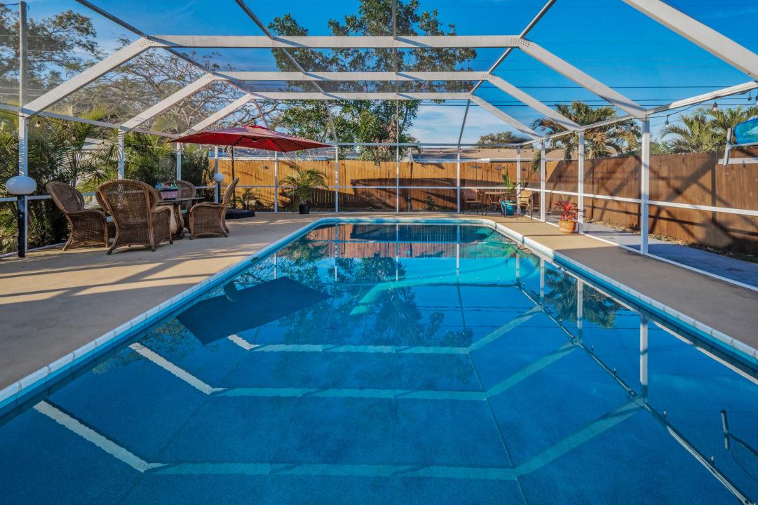 Welcome to this beautifully updated 3-bedroom, 2-bathroom NON FLOOD ZONE pool home in the heart of Seminole! A gorgeous, upgraded kitchen welcomes you inside, featuring a center island with bar seating, custom white cabinetry, granite countertops, a large farmhouse sink, and a built-in wine rack—perfect for the home chef and entertainer alike. Stainless steel appliances complete the space, seamlessly flowing into the open-concept dining and living areas. The spacious dining room provides plenty of room for hosting guests, while the cozy living room features a wood-burning fireplace and French doors that lead to the pool area, creating an effortless indoor-outdoor living experience. The primary suite boasts a walk-in closet, while two additional guest bedrooms share a hall bath with a tub/shower combo. The 3rd bedroom, currently used as an office, features custom built-ins for a stylish and functional workspace. Step outside to your private backyard retreat, where a recently resurfaced pool (2022) with a new pump/motor (2024) awaits. Whether you're cooling off on a warm Florida day or enjoying an evening swim under the stars, this sparkling oasis is the ultimate space for relaxation. The oversized deck offers plenty of room for lounging, sunbathing, or hosting weekend barbecues. Surrounded by lush landscaping and enclosed by a newly rescreened enclosure (2024), this pool area is designed for year-round enjoyment and effortless maintenance. Beyond the pool, a spacious yard offers ample room for kids, pets, and entertaining. This home has been meticulously maintained, with recent upgrades including exterior paint (2024), custom-built bookshelves/cabinets (2023), a new roof (2022), bathroom renovations (2023), a garage door replacement (2022), and an updated electric panel. Just 5 minutes to Seminole City Center, where you’ll find shopping, dining, and entertainment. A quick drive to the Gulf beaches makes beach days effortless, and the home is conveniently close to local parks and the Pinellas Trail for biking and walking. Don't miss this incredible opportunity to own a move-in-ready home in a sought-after Seminole neighborhood! Schedule your showing today. Buyer to verify all dimensions.