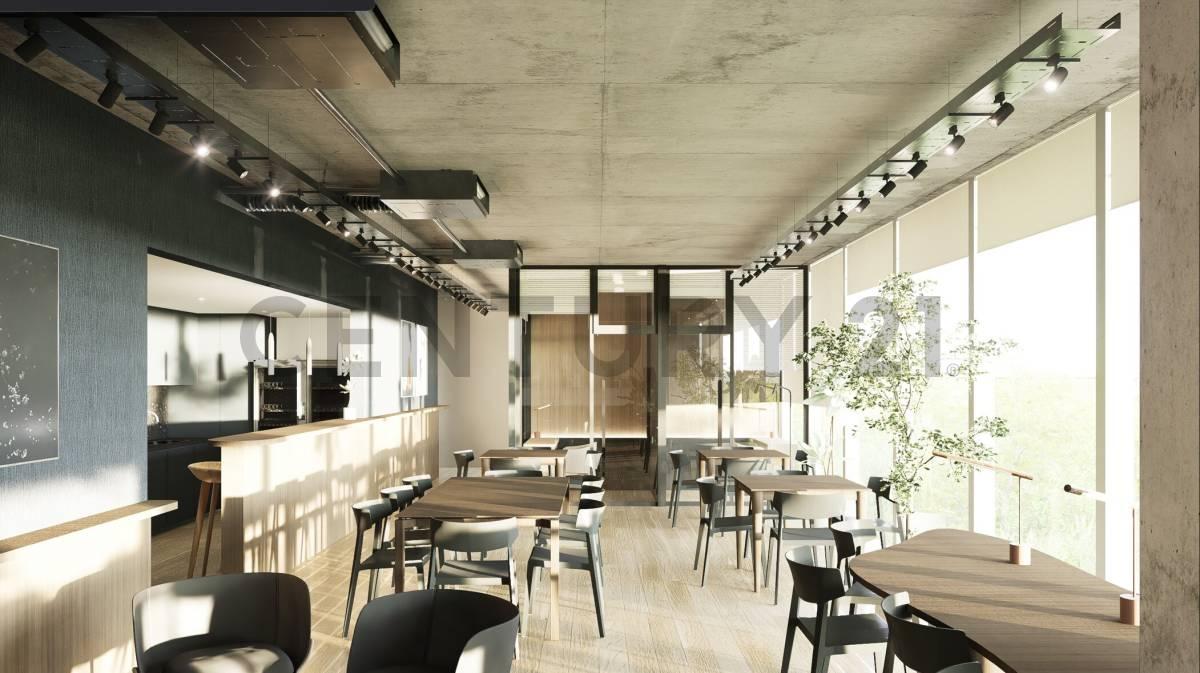 El núcleo sanitario central incluye amplios banos y cocina, la que se integra con el espacio para el bar/comedor, todo oculto del ingreso a la oficina.